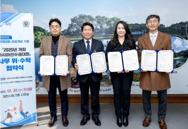 지난 31일 제천시청에서 '2025년 개최 아시아선수권대회'사무 위·수탁 협약식이 김창규 제천시장, 안성국 제천시 체육회장, 오재성 제천시체조협회장, 김은경 제천시롤러스포츠연맹 부회장 등이 참석한 가운데 개최됐다.