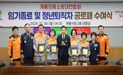 계룡시는 지난 30일 시청 상황실에서 임기 종료 및 정년퇴직하는 의용소방대 임원과 대원들에게 공로패 전달식을 가졌다고 밝혔다.