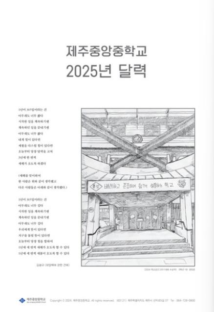 제주도교육청 제주중앙중학교는 2일 2025년 학교 달력을 제작하여 전교생과 교직원에게 배부했으며 내년 신입생들에게도 전달한다.