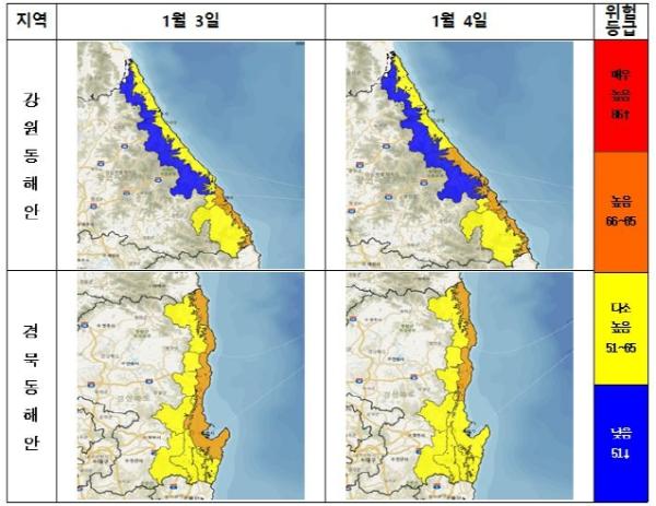 국립산림과학원 산불예측분석센터의 산불위험예측 정보에 따르면, 3일 오후부터 강원·경상 동해안 지역을 중심으로 산불위험지수는 ‘높음’ 이상일 것으로 예측된다.