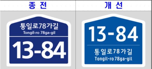 대표적으로 건물번호판이 눈에 잘 띌 수 있도록 기존 남색을 청색으로 변경하며, 더 직관적으로 건물번호를 인식할 수 있도록 기초번호는 위, 도로명은 아래로 배치한다.
