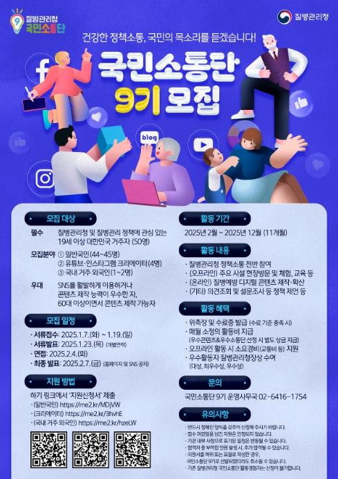 질병관리청은 2025년도 질병관리청의 대국민 소통을 함께할 ‘질병관리청 국민소통단’ 9기를 공개 모집한다.