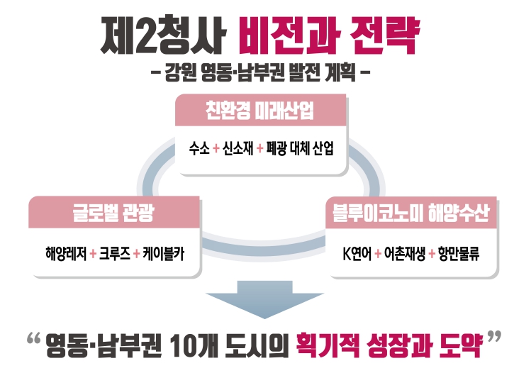강원특별자치도가 강원 영동 6개 시군과 남부권 4개 시군의 획기적인 성장을 도모하기 위해 3대 비전과 9개 전략으로 구성된 '제2청사 비전과 전략'을 발표하며, 구체적인 발전 청사진을 제시했다.