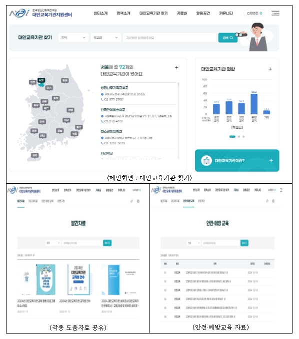 ‘대안교육기관 지원센터’ 누리집은 대안교육기관에 관심 있는 학생·학부모 등에게 시도교육청에 등록된 대안교육기관별 운영 정보를 제공하며, 대안교육기관의 교육활동을 지원하는 다양한 도움 자료를 공유하기 위하여 구축됐다.