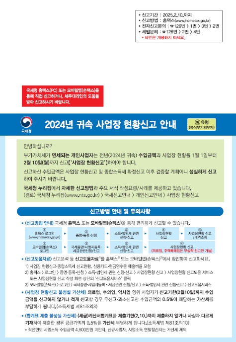 국세청은 주택임대사업자 등 면세사업자 158만 명에게 2024년 귀속 사업장 현황신고 안내문을 2025년 1월 20일부터 모바일로 발송한다.