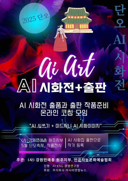 『인공지능(AI)과 ‘단오 민족예술’의 융합 창작』이라는 주제로 개최되는 이 번 ‘단오 AI 시화전’은 인공지능문화예술협회가 지역 활동으로 참여하고 있는 (사)강원민예총 원주지부(회장 김옥주, 예술인)에서 개최 예정인 강원특별자치도 원주시의 5월 31일 단오축제 행사 내의 부속 전시 행사로 진행된다.