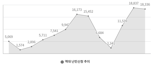 법무부는 2024년 12월 31일 현재 누적 난민신청 건수가 12만 건을 넘었다고 발표하였다. 2013년 난민법 시행 이후 2013년 1,574건에서 2023년 18,837건(역대 최대)으로 약 12배 급증하였으며, 2024년 12월 누적 난민신청 건수는 122,095건에 달했다.