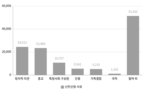 난민신청 사유는 정치적 의견(24,513건)이 가장 많았으며, 종교(23,480건), 특정사회 구성원(10,757건), 인종(5,541건), 가족결합(5,210건), 국적(1,162건)이며, 난민협약 이외의 사유, 즉 경제적 목적, 사인 간 위협 등의 사유로 신청한 건수가 51,432건으로 전체의 약 42%를 차지하고 있다.