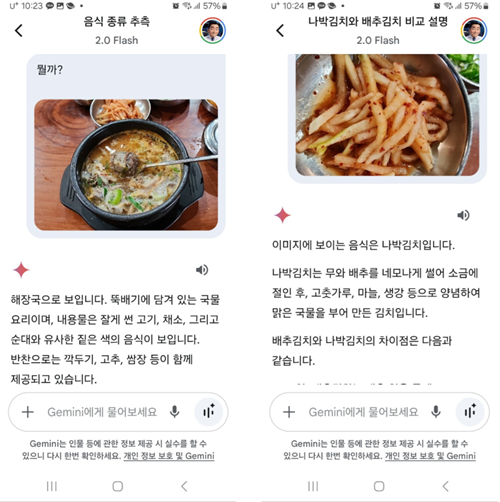 하지만 구글의 AI 서비스인 제미니(Gemini)는 실망스러웠다. 전혀 다른 답을 내놓았다. 앞선 두 가지의 AI와 같은 사진을 보여주었음에도, 제미니는 음식 종류를 정확히 인식하지 못했다. 첫 답변에서는 해장국이라하고, 힌트가 더해 진 두번째 답변에서도 해장국이라고 한다. 무생채 반찬에 대해서는 앞선 두 가지의 AI가 정확히 맞춘 것에 반해, 구글의 제미니 AI는 나박김치라고 했다.