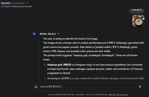 | ▲구글 제미니 2.0플래시 씽킹 실험버전의 순대국밥 인지테스트 |