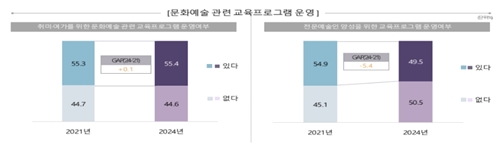 협회·단체에서 취미·여가를 위한 문화예술교육 프로그램을 운영하고 있다는 응답은 55.4%, 전문 예술인 양성을 위한 문화예술교육 프로그램을 운영하고 있다는 응답이 49.5%로 나타났다.