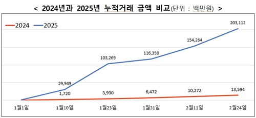 농림축산식품부(장관 송미령, 이하 농식품부)는 농수산물 온라인도매시장 거래 금액이 2,000억원(2월 24일 기준)을 돌파했다고 밝혔다. 이는 전년 동기(136억 원)대비 약 15배 높은 금액이며, 전년도 2천억 원 돌파 시점(8월 20일) 대비 6개월 더 빠른 기록이다.