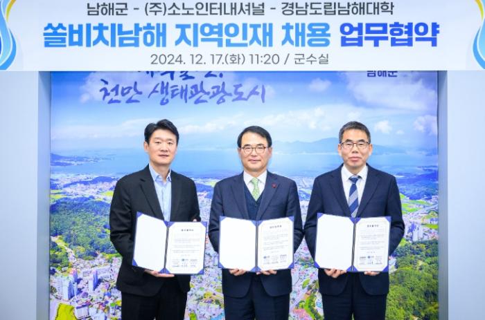 남해군, ㈜소노인터내셔널 쏠비치 남해, 경남도립남해대학은 17일 남해군청에서 ‘쏠비치 남해 지역인재 채용을 위한 업무협약’을 체결했다.