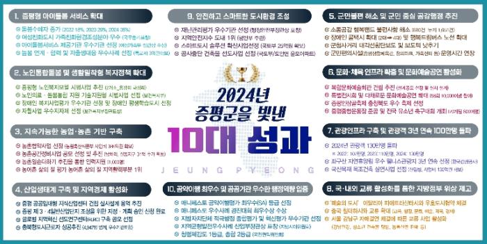 군이 발표한 10대 성과는 △증평형 아이돌봄 추진을 통한 저출산 위기극복 및 돌봄서비스 확대 △증평형 노인통합돌봄 및 생활밀착형 복지정책 확대 △지속가능한 농업·농촌 기반구축 △산업생태계 구축 및 지역경제활성화 △군민불편 해소 및 군민 중심 공감행정 추진 등이다.