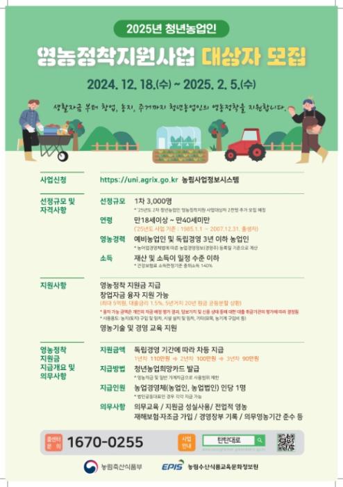 • 농림축산식품부는 12월 18일부터 ?2025년 청년농업인 영농정착지원사업? 대상자 선발을 위한 1차 모집을 시작했다.