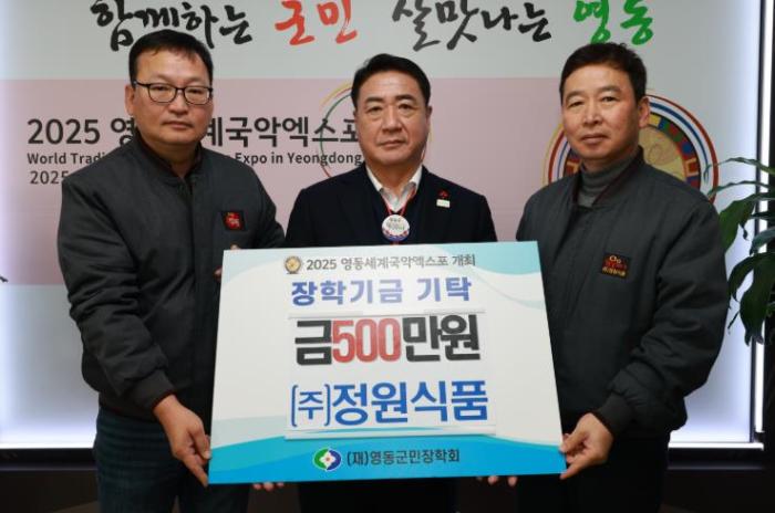 ㈜정원식품은 지역사회에 꾸준한 기부를 실천해 온 기업으로, 2021년부터 장학금 1,000만원 기탁을 시작으로, 2022년에는 500만원, 2023년에는 300만원을 기탁하며 영동군민장학회에 총 2,300만원을 후원했다.